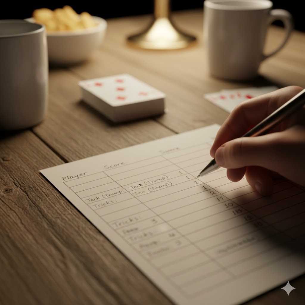 Kierroksen jälkeen lasketaan molempien joukkueiden saamat pisteet. Jos tarjouksen voittanut joukkue sai vähintään tarjouksensa verran pisteitä, he saavat kaikki keräämänsä pisteet (esim. jos tarjosivat 8 ja saivat 10, he saavat 10 pistettä). Jos he epäonnistuvat, he saavat miinuspisteitä tarjouksensa verran. Vastustajajoukkue saa aina keräämänsä pisteet talteen. Peli päättyy, kun toinen joukkue saavuttaa 62 pistettä. Jos molemmat ylittävät 62 samalla kierroksella, tarjouksen voittanut joukkue on yleensä etusijalla, mutta tästä on olemassa eri sääntövariaatioita.